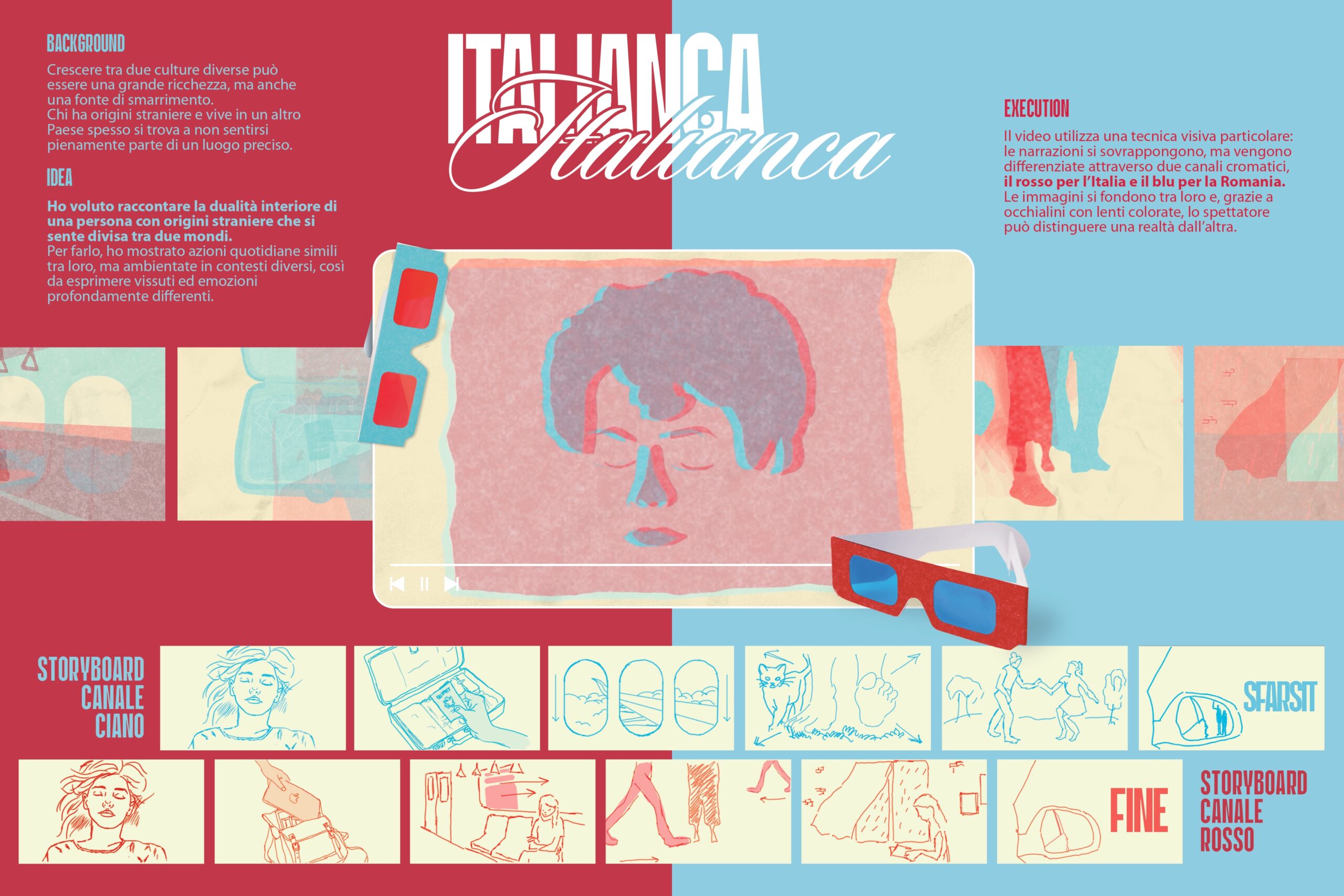 Il suo progetto, “Italianca”, è un video intenso e introspettivo che esplora la complessità dell’identità di chi cresce tra due culture diverse. Sara ha voluto raccontare la dualità interiore di una persona con origini straniere che si sente divisa tra due mondi, mostrando azioni quotidiane apparentemente simili ma ambientate in contesti differenti, a rappresentare vissuti ed emozioni contrastanti.
