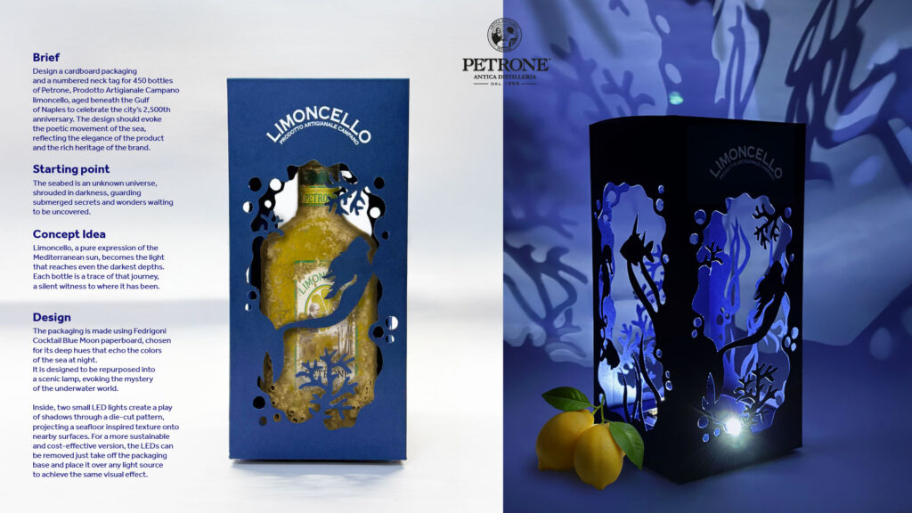 Il progetto di packaging per il limoncello Petrone, realizzato da Sara Petrucci e Vincenzo Volino, e il progetto “Un dono dagli abissi” firmato da Chiara Sales, Chiara D’Auria e Daria De Falco, rappresentano l’eccellenza e la creatività del percorso formativo IUAD, in cui ricerca, innovazione e sensibilità estetica si fondono per dare vita a proposte originali e contemporanee.