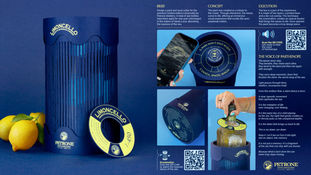 Il concept trae ispirazione dal moto perpetuo del mare, che viene tradotto visivamente attraverso la tecnica della scanimation: l’effetto moiré crea l’illusione di onde in movimento, rendendo il packaging un oggetto vivo e ipnotico. Ad accompagnare il design, un audio-storytelling immersivo che racconta la voce del mare e di Partenope, invitando chi lo ascolta a vivere il prodotto come un’esperienza narrativa e sensoriale, oltre che estetica. Un progetto che fonde comunicazione visiva, tecnologia e poesia.